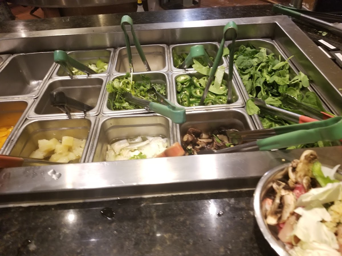 The food was very good...I love a place that has such a great assortment if different fresh meats, veggies, spices and sauces to out together to make your perfect meal. The service was very friendly and the server was very informative in hiw the process goes here, made great suggestions and kept us all happy. Plus provided nice to go boxes and sauce boxes for take home after we finished eating. The atmosphere was friendly, happy and clean. Everyone around us was also enjoying themselves. We will be back with our friends to see how high we can build our bowl of favorite foods. Thank you gor great lunch experience! Rocky in Austin area